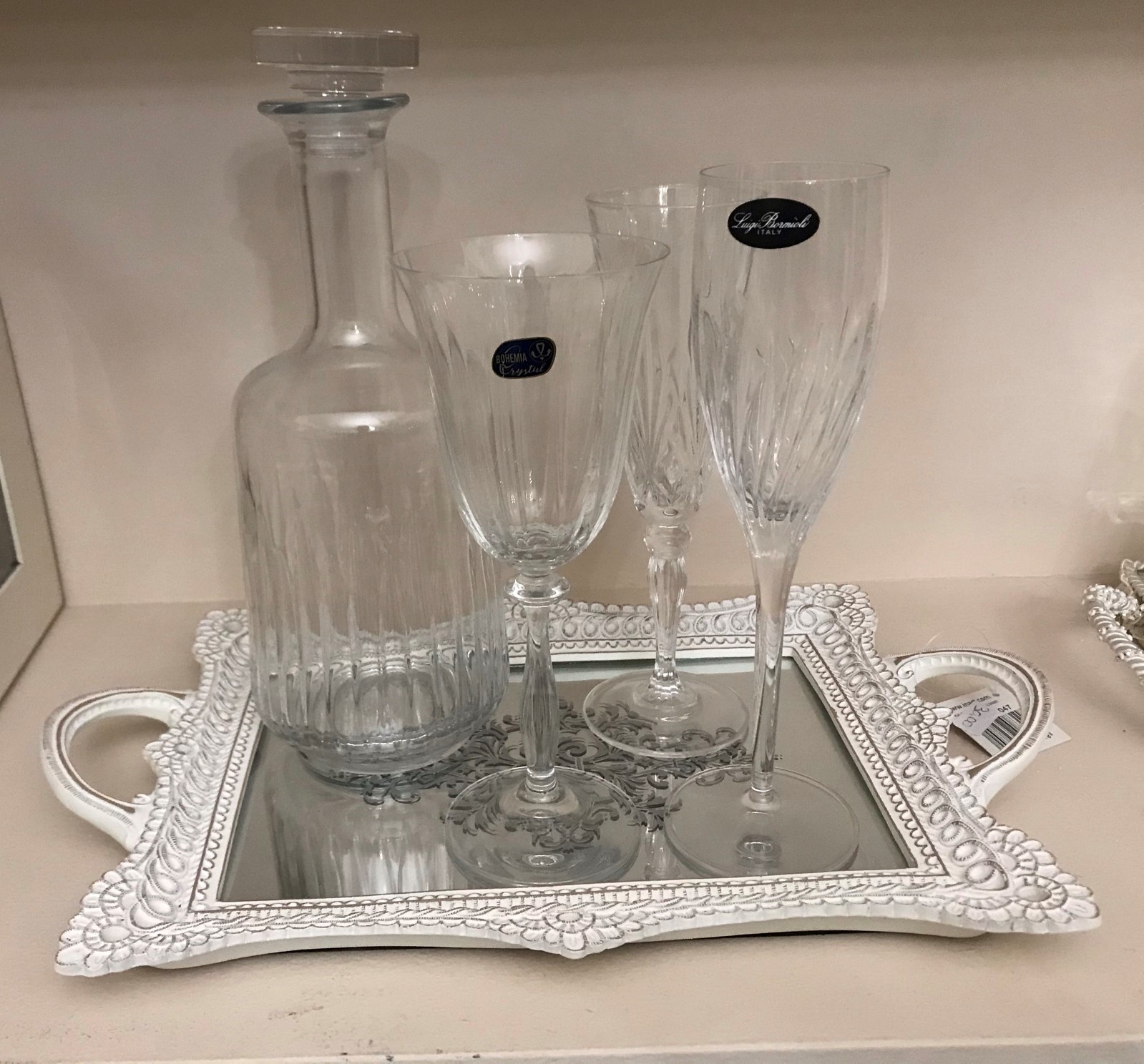 Δίσκος με καράφα και ποτήρι για το μυστήριο του γάμου σε λευκό χρώμα. Το σετ περιλαμβάνει μία καράφα, ένα ποτήρι για το κρασί και 2 ποτήρια για σαμπάνια.